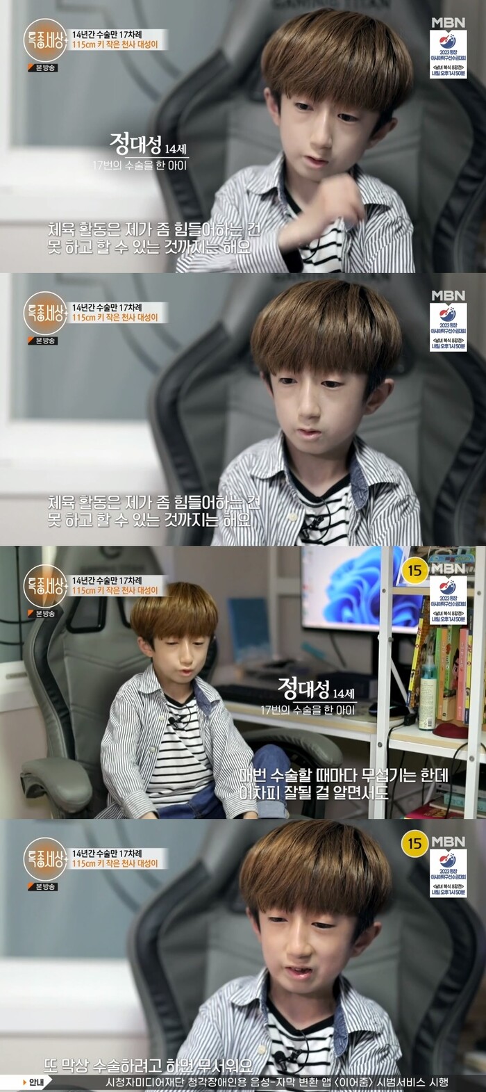 이날 방송에서 키 115㎝에 몸무게 15㎏인 정대성 군은 원인 모를 희귀병으로 17차례 수술을 받았다고 전했다. 아빠는 "영양분이 부족해서 그렇다"며 "몸애 영양분이 부족하면 껍질이 벗겨진다"고 말했다.